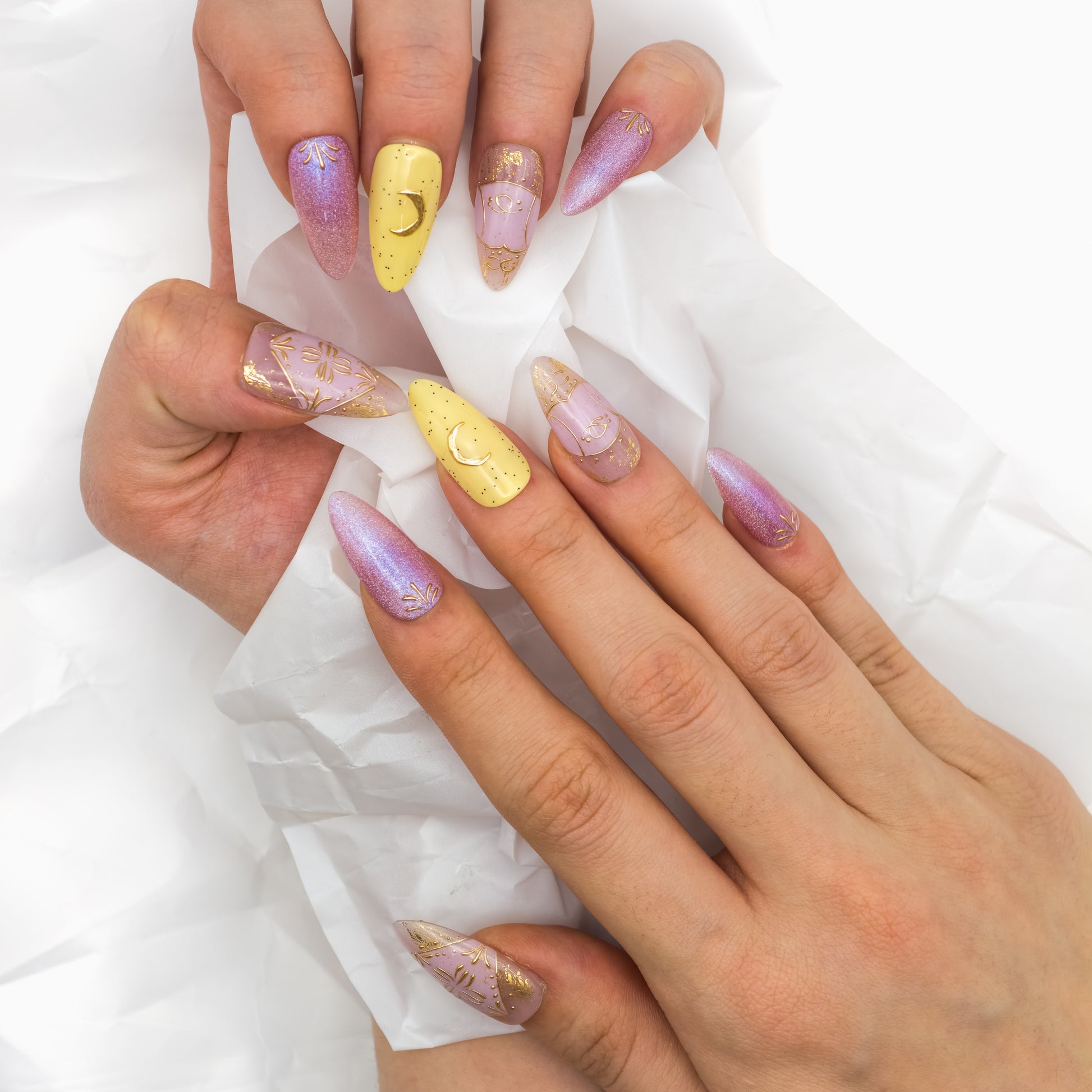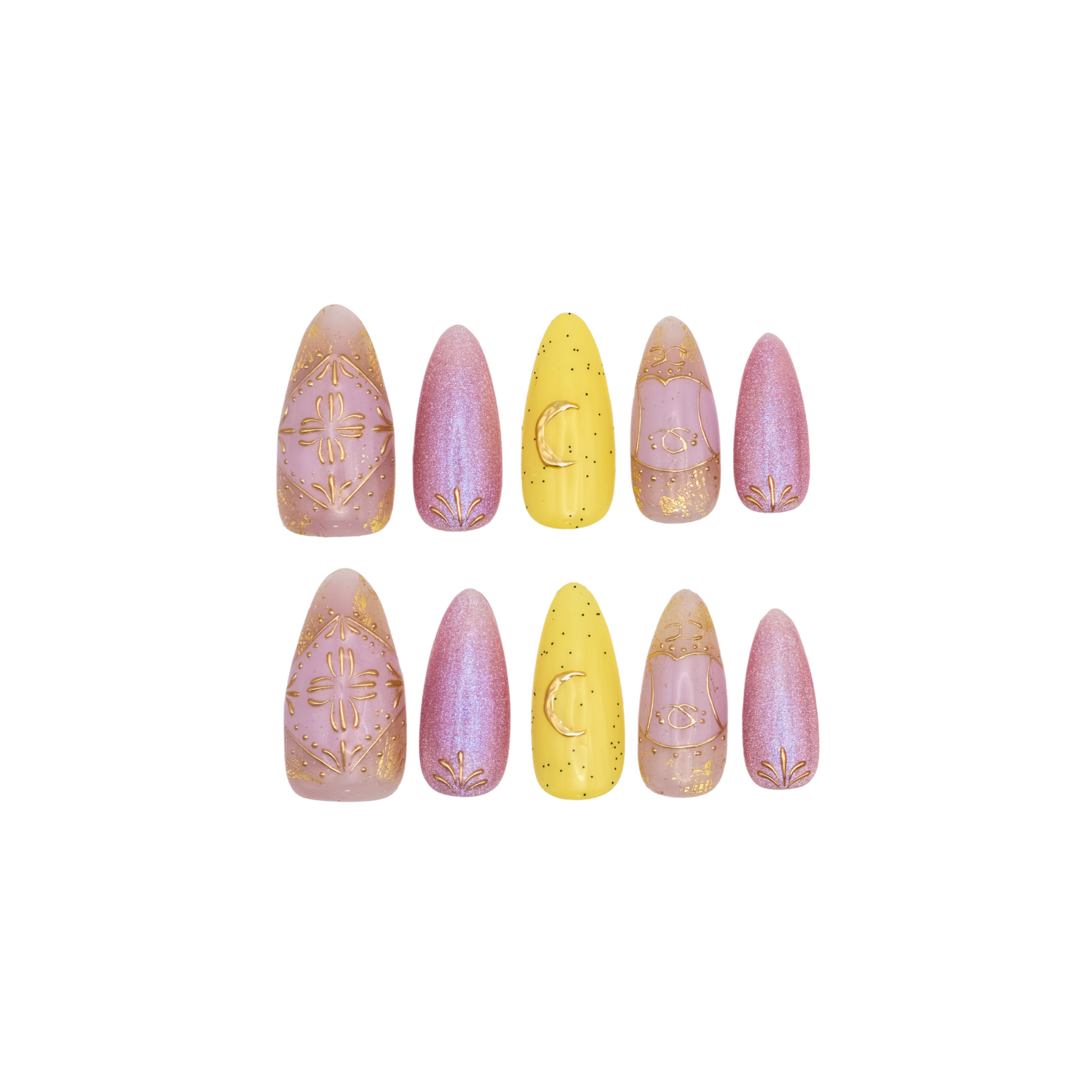 A playful mix of shimmering pink, bright yellow, and gold celestial symbols, this set brings starry vibes and festival fun. The design celebrates individuality with a bold twist. Crafted with durable, high-grade materials, each nail showcases our commitment to beauty, creativity, and lasting wear.