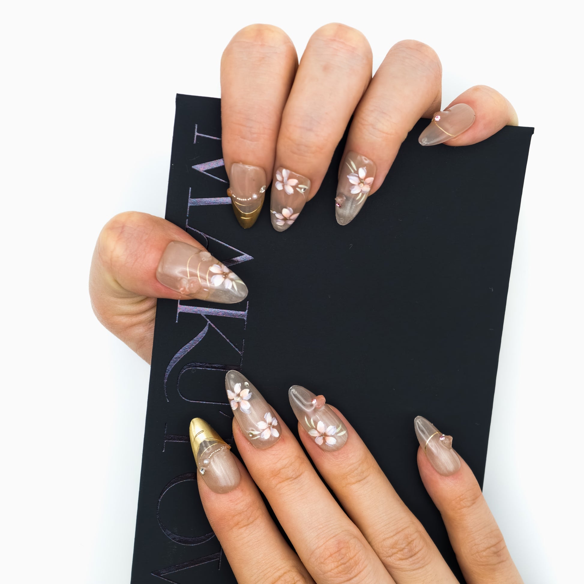 Elegant cherry blossoms bloom over a soft nude base, highlighted by gold accents and delicate gems. This set captures the grace of spring with a touch of luxury. Made from high-quality materials, our nails are durable, reusable, and crafted with exquisite attention to detail for a natural, salon-perfect look every time.